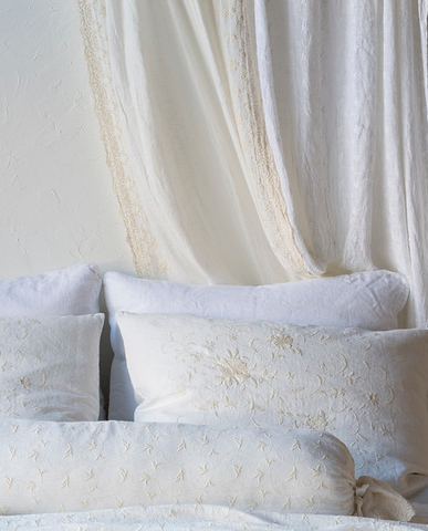 Scalloped edges and exquisite needlework add vintage colonial charm to Linen Whisper. Available in all current colors. Inserts not included unless noted.