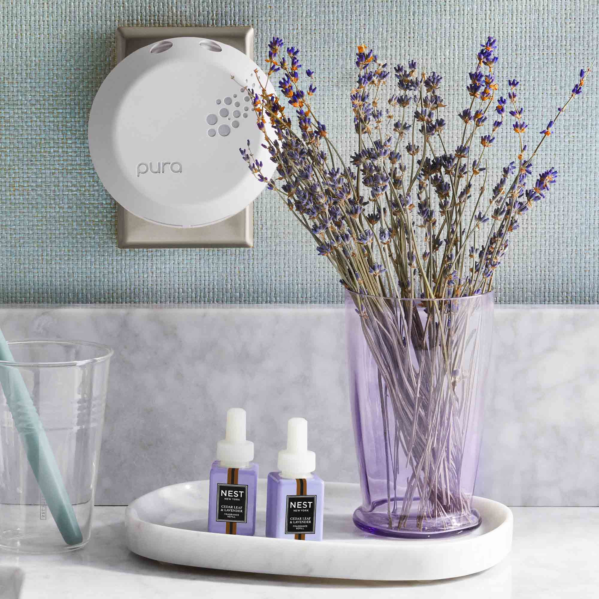 Create a serene spa-like experience with this exquisitely fragranced NEST x Pura Smart Home Fragrance Diffuser Refill Duo featuring an herbaceous blend of rosemary, lavender, and sage enhanced with cedar leaves.