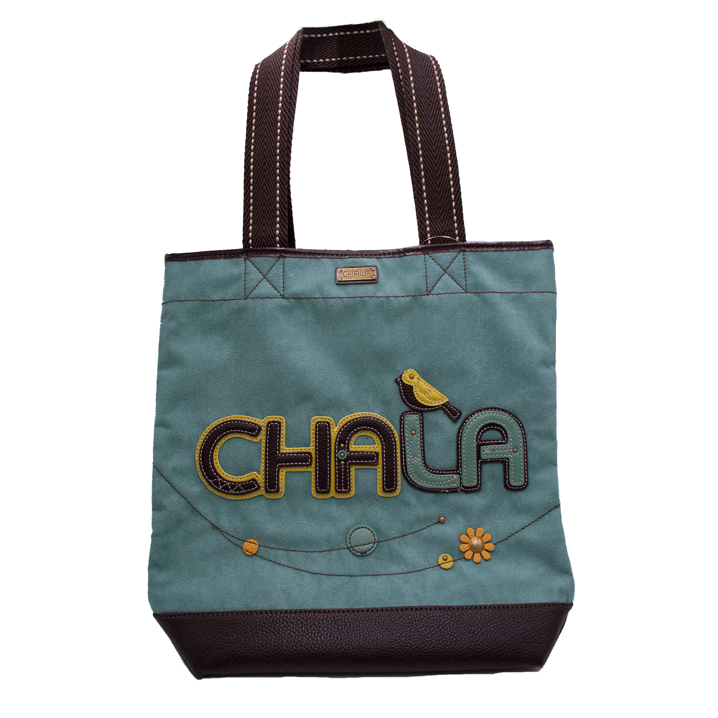 Roomy tote with Chala spirit big enough for books, wallets, or tablets. Includes two inner pockets, one outer zipper pocket, two handles, and a buttoned closure.