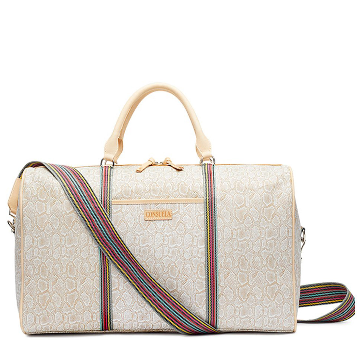 Consuela's largest duffel style, the Weekender, is Consuela's go-to for big hauls. This Clay embossed snake print duffel is roomy enough for all your essentials and features leather handles, an adjustable crossbody length webbing strap, two interior pockets, and two exterior pockets. If you re looking for a TSA carry-on compatible bag, check out the Jetsetter or the Zipper Tote!