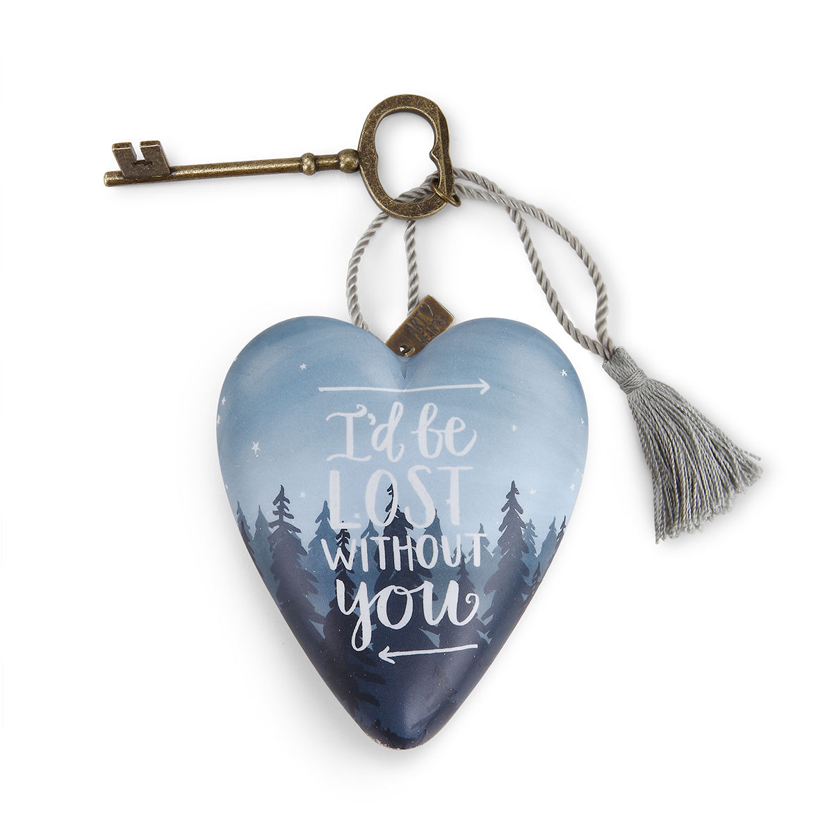 Heart can hang using attached cord/tassel, or stand with attached key easel.