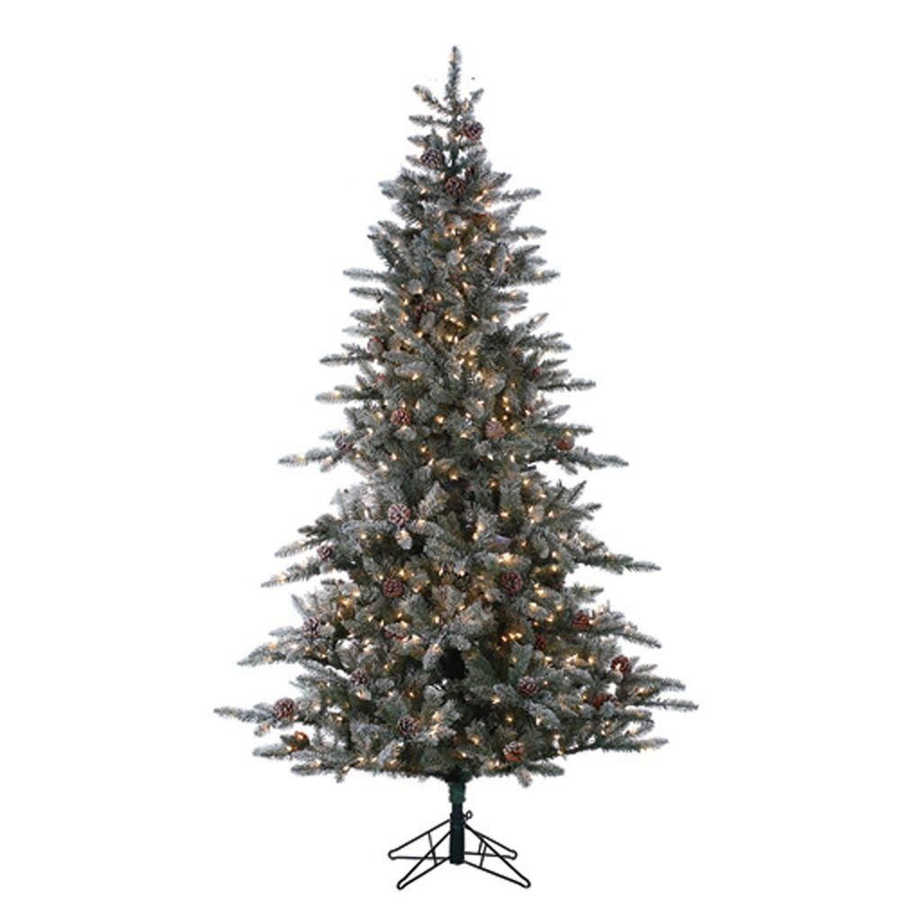 Ease into the holidays with this awe-inspiring pre-lit artificial lightly flocked McKinley Pine Christmas tree so realistic it could fool your gardener! A towering 7.5-feet high with that a lightly flocked look and a shapely base diameter of 54-inches, this stunning Pine comes with 650 clear incandescent bulbs to add a warm, hearth-and-home glow, but without the mess and fire dangers of a live-cut tree. Safe, fire-resistant needles provide an amazing 1102 Pine branch tips to put your favorite ornaments on display. It's an eye-catching centerpiece providing the cheer to make your holidays a lasting memory. Comes with a 21-inch diameter, sturdy four-prong stand for safety and stability.