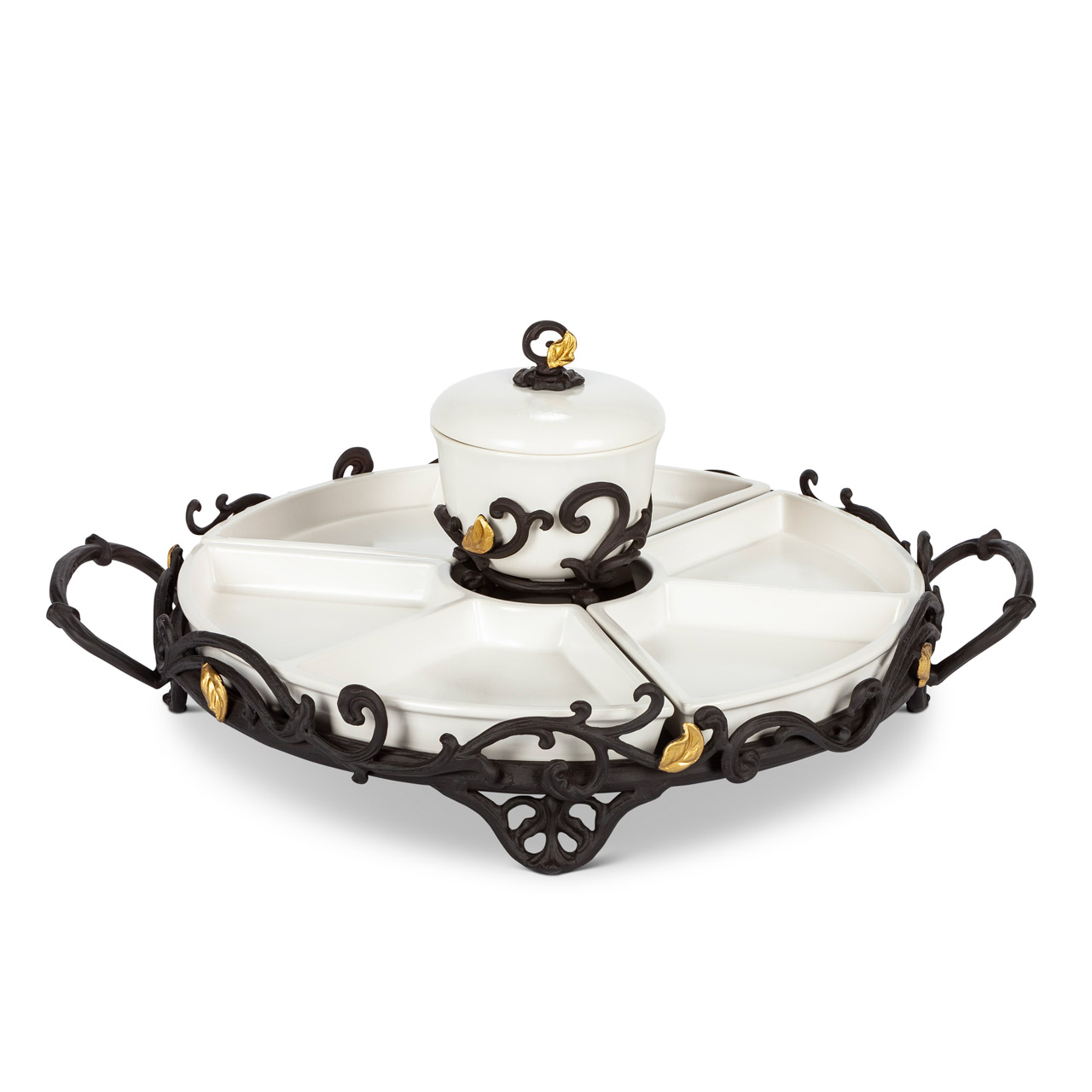 White Stoneware Crudite Server with Metal Gold Leaf & Vine Handled Base.