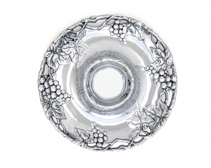 Embellish colorful snacks and salsas with the intricate detail of Arthur Court's best-selling Grape Chip and Dip. Crafted with striking definition, bundles of grapes and leaves hang off the edges of this handmade, aluminum piece. More fruit and foliage appear on the sauce bowl, but in softer lines than the surrounding designs.