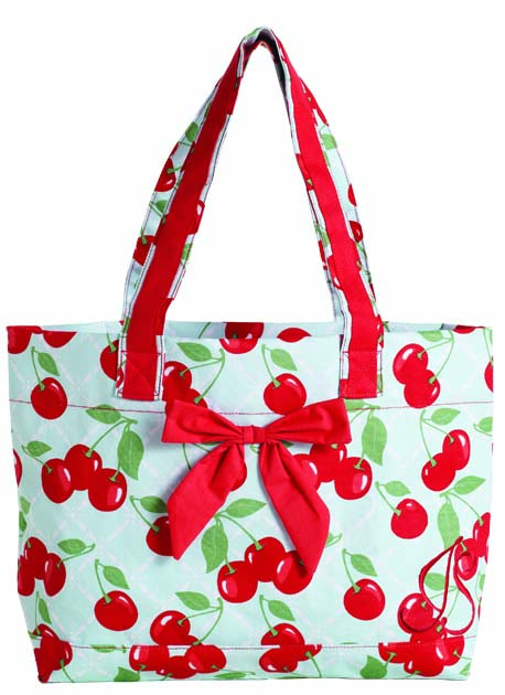The Tote Bag with Bow in the Kitchen Cherry print features a sweet-as-cherry-pie country flair design of bright red cherries on a light blue background and accented with a red bow and trim. It is equipped with two sturdy handles. Collect the entire set!