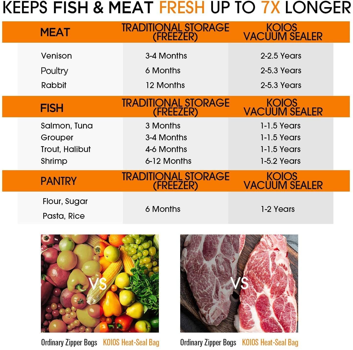 Smart Meal Preparation Save time by simply speeding things up on preparing your breakfast sandwiches. Simply assemble several sandwiches at once, and then seal in individual bags and freeze them. Heat one up in the microwave for an instant and delicious breakfast. | Effectively Increase Food Shelf Life KOIOS Vacuum Sealer sucks the air out and has a heat sealer to seal the durable airtight bag that preserves the aroma, freshness, taste, and shelf-life of cookies, fish, fruits, meat, vegetables or other food items for later consumption. | Seals ‘Dry’ and ‘Moist’ Food Simply use the "Dry" or "Moist" feature if you’re sealing dry foods or with moisture. And it will reduce the oxygen on the airtight bag or pull any added moisture. Prolong the freshness and shelf life of your food with KOIOS Vacuum Sealer. | Accessory Hose Port KOIOS vacuum sealer comes with an accessory port feature. It can preserve food with vacuum canister & compatible with wine stoppers. |