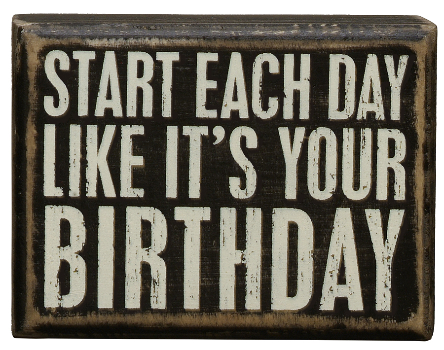 This wooden box sign features a vintage look of black paint with worn edges. The white lettering reads "Start each day like it's your BIRTHDAY".