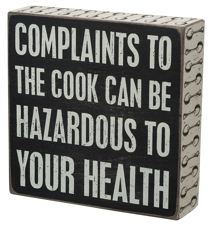 This wooden box sign features a vintage look of black paint with worn edges. The white lettering reads "COMPLAINTS TO THE COOK CAN BE HAZARDOUS TO YOUR HEALTH".