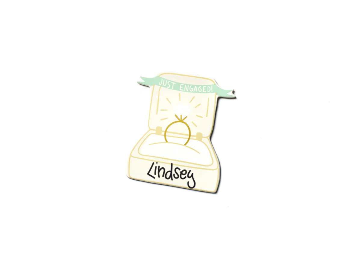 A happy life begins the minute she says, I Do. Let Happy Everything's Ring Box Mini Attachment be a special reminder of the Big Moment with a neutral color palette for the box, a sparkling diamond ring with metallic gold accents, and a cheerful mint green banner proclaiming, Just Engaged! You will love moving this interchangeable décor from base to base throughout your home. Gift this celebratory design to a newly engaged couple and help them start their life together with happy décor that tells their story.