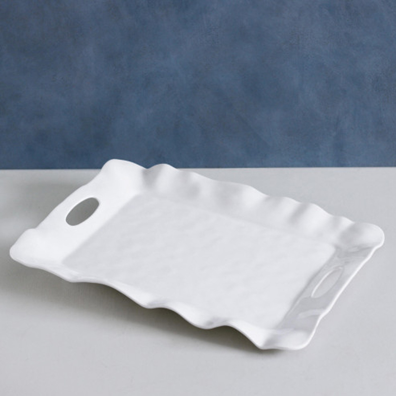 An ample serving area and notched handles make this White Rectangular Tray a shining star in an innovative Havana Collection, a luxury melamine line designed with distinctive Beatriz Ball flair. Fabulous for passing around snacks or drinks, the tray also makes a statement perched on the bar or kitchen island. Perfectly suited for indoor and outdoor entertainment, this Havana tray is designed for everyday enjoyment. You may pair the platter with other white melamine pieces for a coordinated serving set, or mix and match with coral or aqua Havana Collection items for a festive and vibrant table display. Works well with any items from Beatriz Balls signature metal line, too. Having the substance, weight and appearance of ceramics, this white melamine tray is as beautiful as it is versatile. Makes a unique gift.