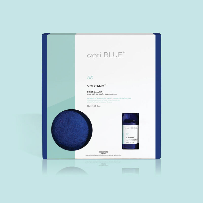 Say hello to your dryer's new best friend! Capri Blue's Volcano™ Dryer Ball Kit is designed to soften fabrics while adding a touch of your fav fragrance. It includes 3 wool dryer balls in our iconic cobalt blue + Capri Blue's famous Volcano fragrance oil - formulated with grapefruit and tangerine essential oils. The dryer balls are long-lasting, machine washable and hand-made with 100% pure wool and colorfast dye that won't bleed. But wait - it doesn't stop there. They also eliminate wrinkles, static, and lint, making this Dryer Ball Kit a win, win for you (and your dryer)! For the ultimate fragrance experience use alongside Capri Blue's Concentrated Laundry Detergent and Fabric Softener.