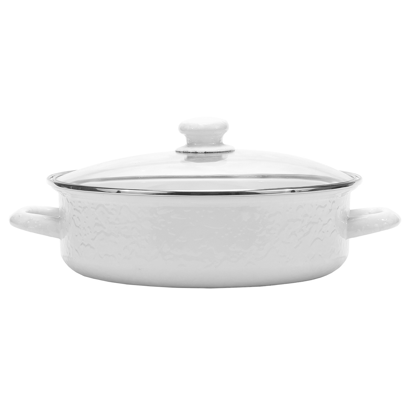 5 qt Saute Pan. This enamelware is made of carbon steel coated with a porcelain enamel and trimmed in stainless steel. There will be variations in the shading of colors and pattern formations which are the results of the hand-dipped process. Made in Indonesia.