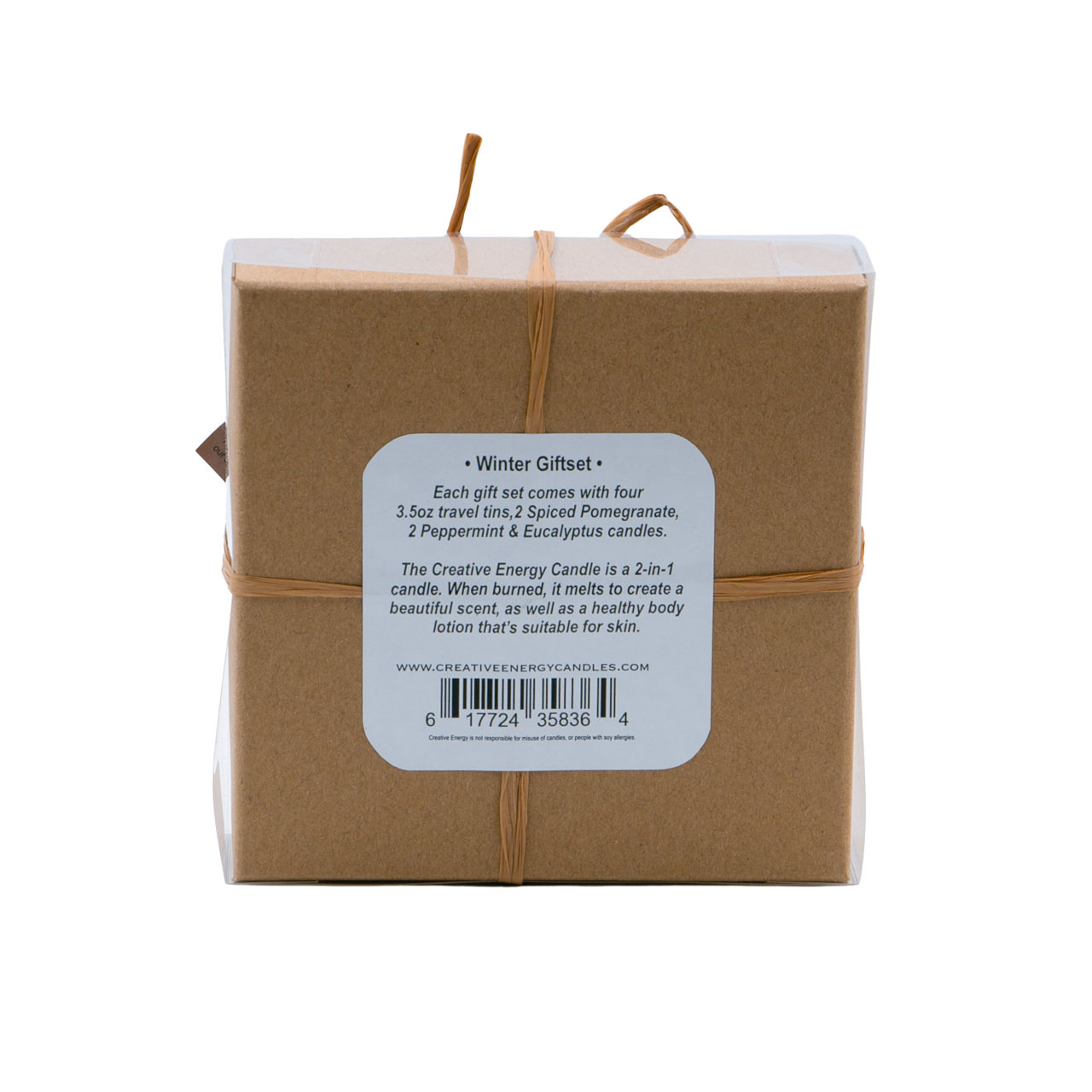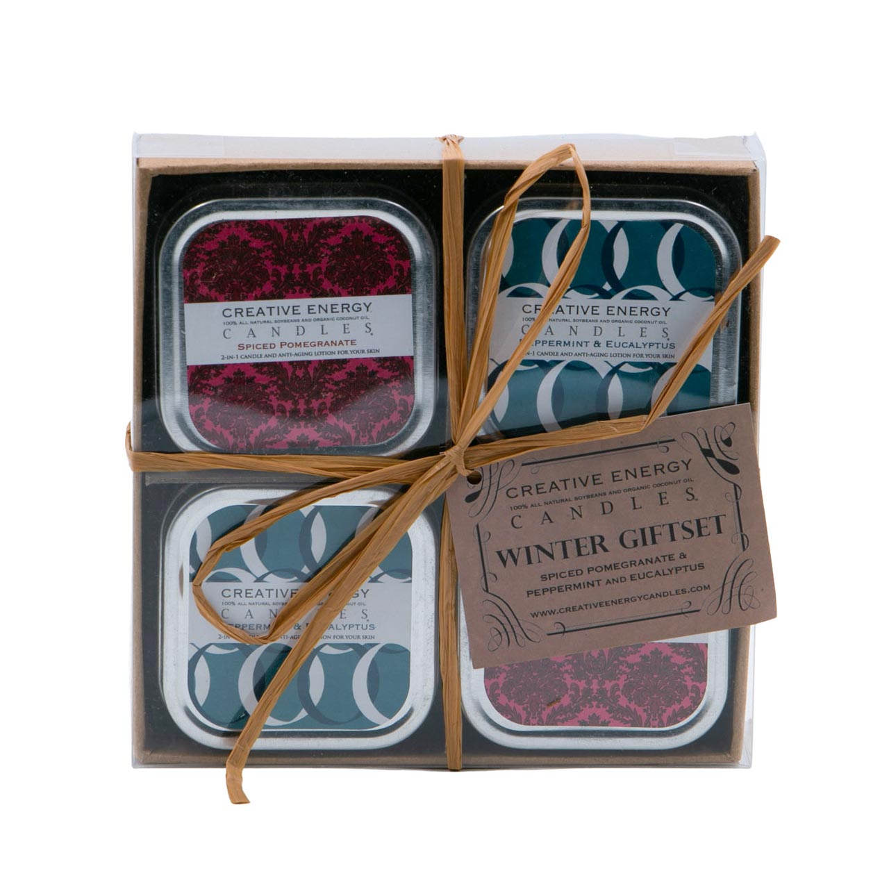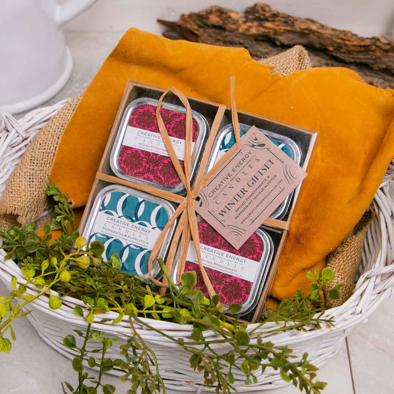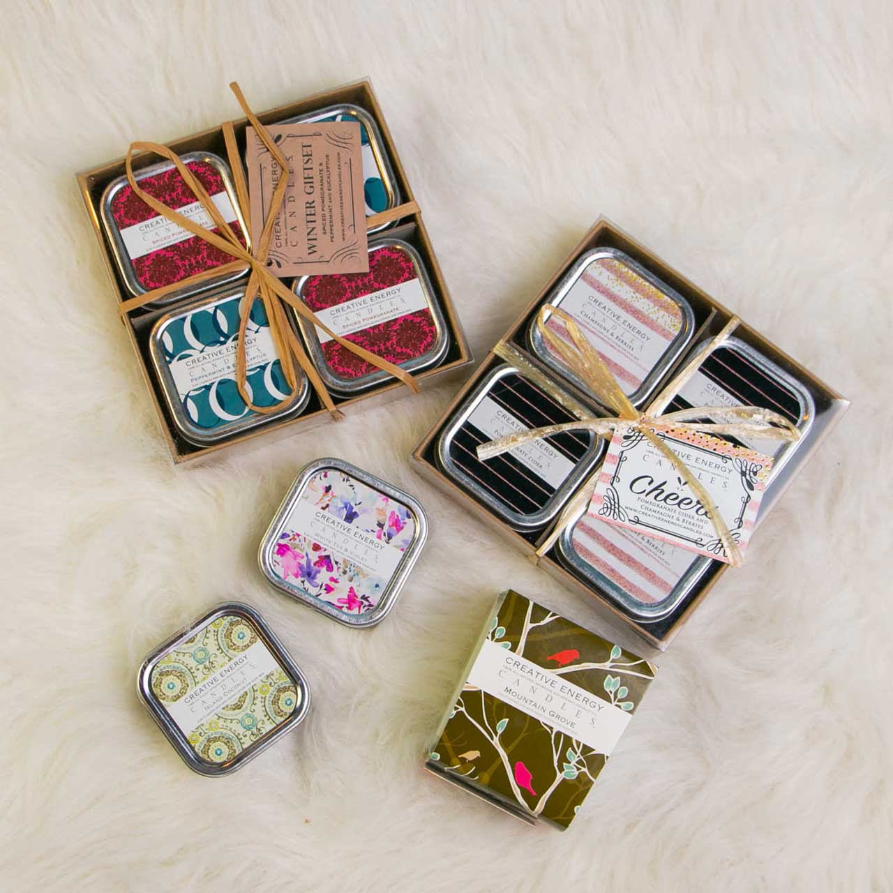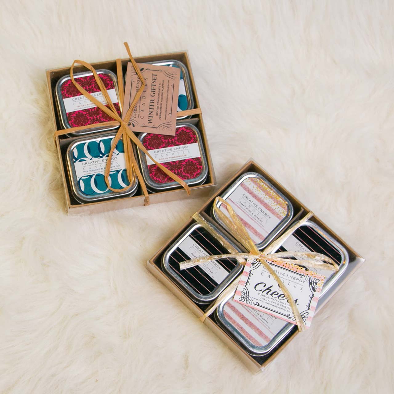 Each gift set comes with a set of four 3.5 oz. travel tins. Each box is hand-wrapped with a custom label and ribbon in Columbia, SC.