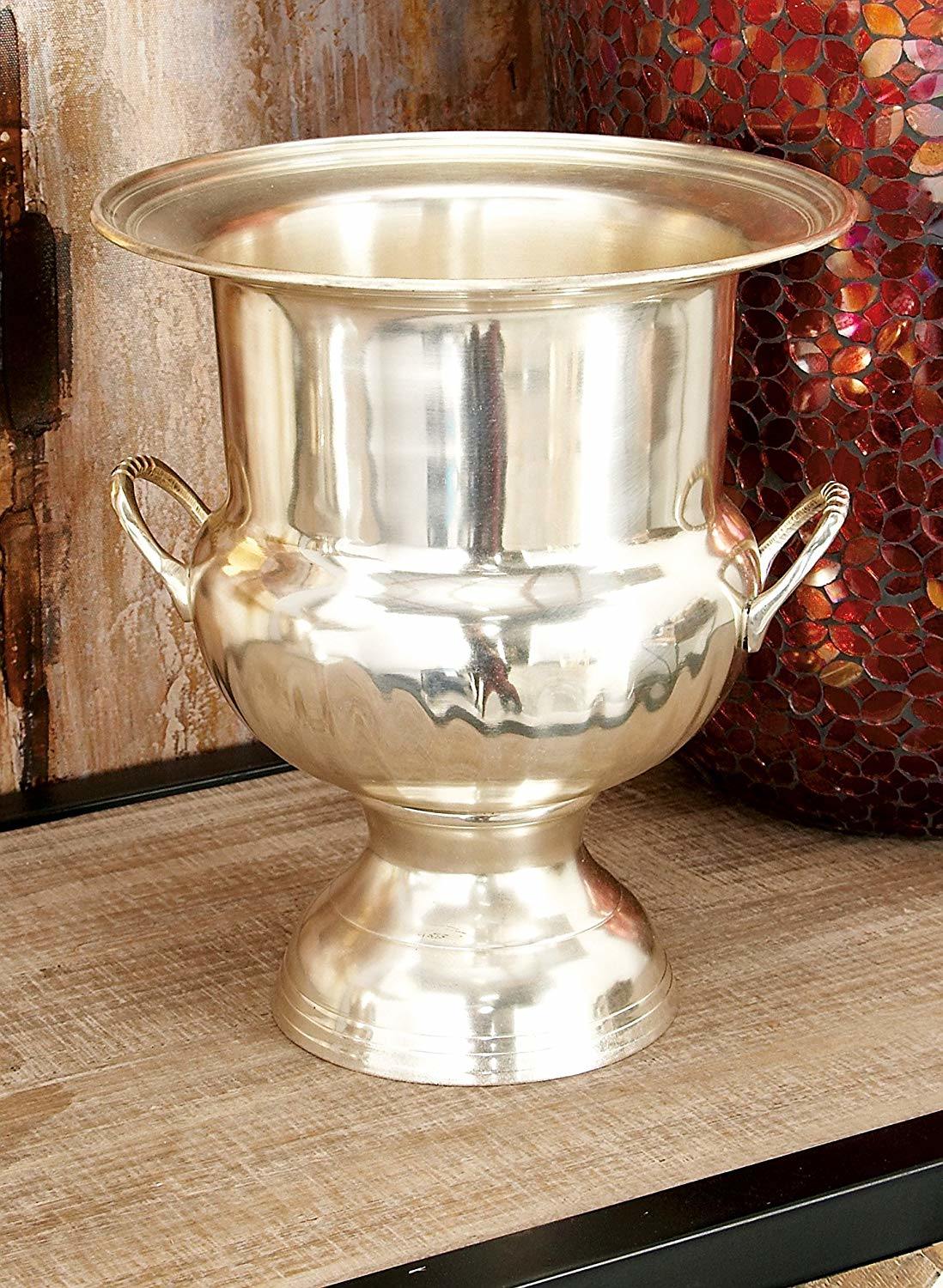 This wine bucket is elegantly designed in traditional style, made up of brass with a silver finish which ensures its durability. The exterior of this wine bucket offers timeless appeal, while the folding ring side handles are as utilitarian as they are stylish. With a weight capacity of approx 2 litres, you can keep it anywhere in your kitchen, dining spaces or on the console table for easy serving, when filled with ice.