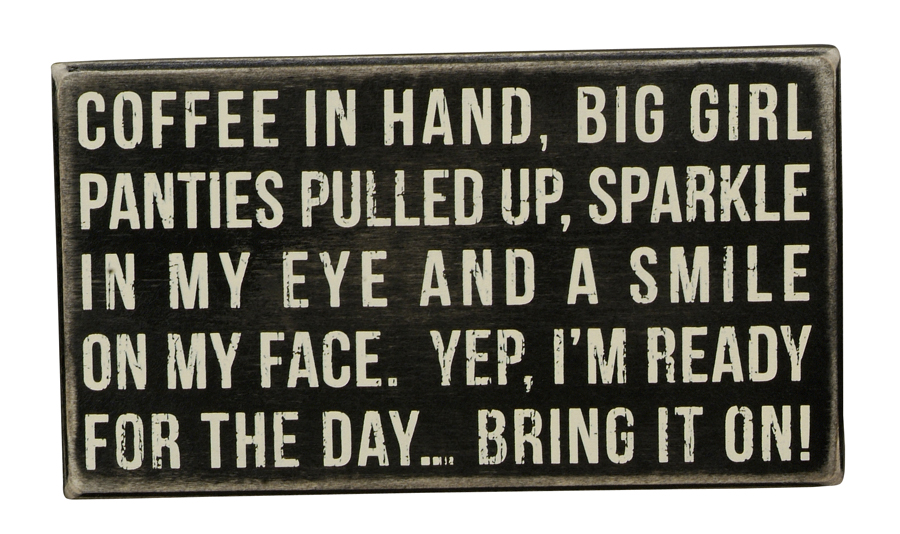 This wooden box sign features a vintage look of black paint with worn edges. The white lettering reads "COFFEE IN HAND, BIG GIRL PANTIES PULLED UP, SPARKLE IN MY EYE AND A SMILE ON MY FACE. YEP, I'M READY FOR THE DAY €BRING IT ON!".