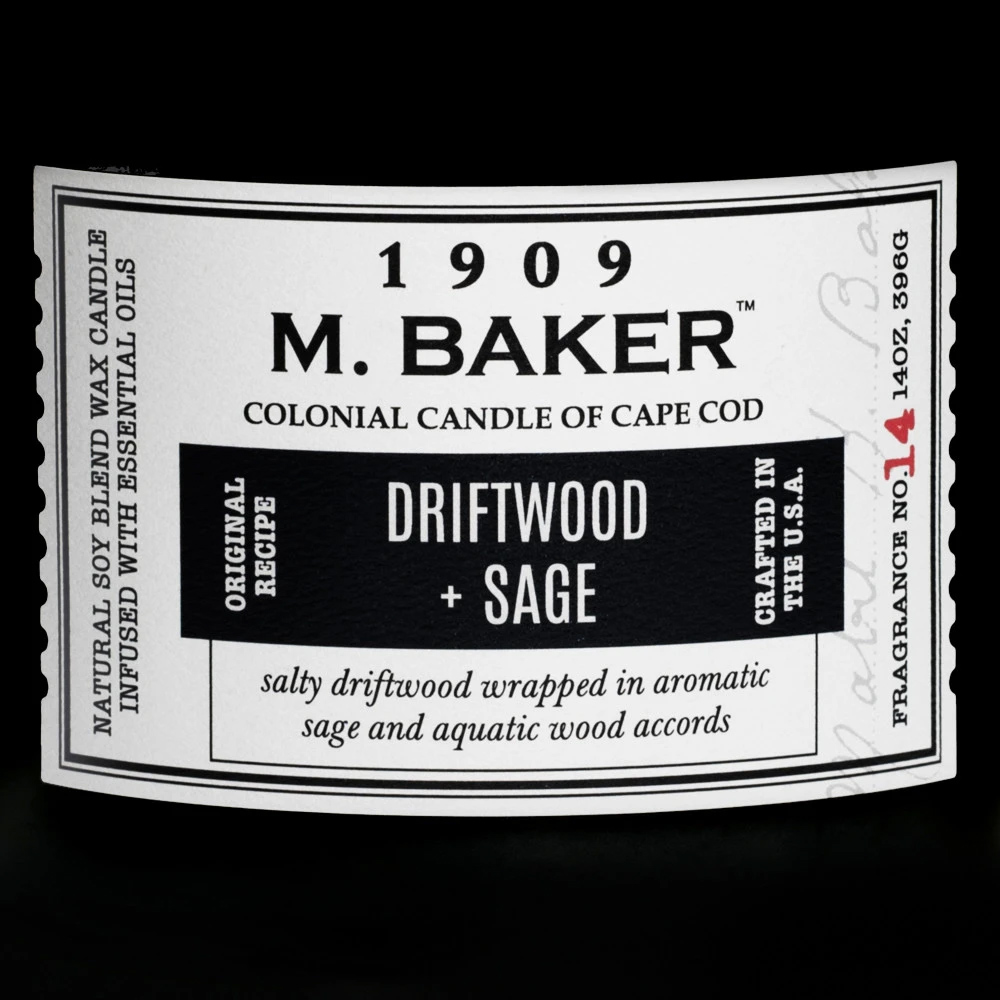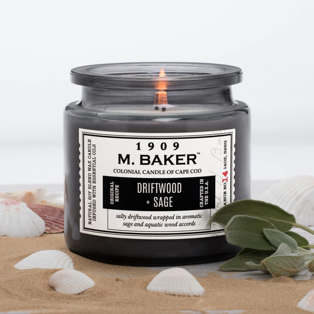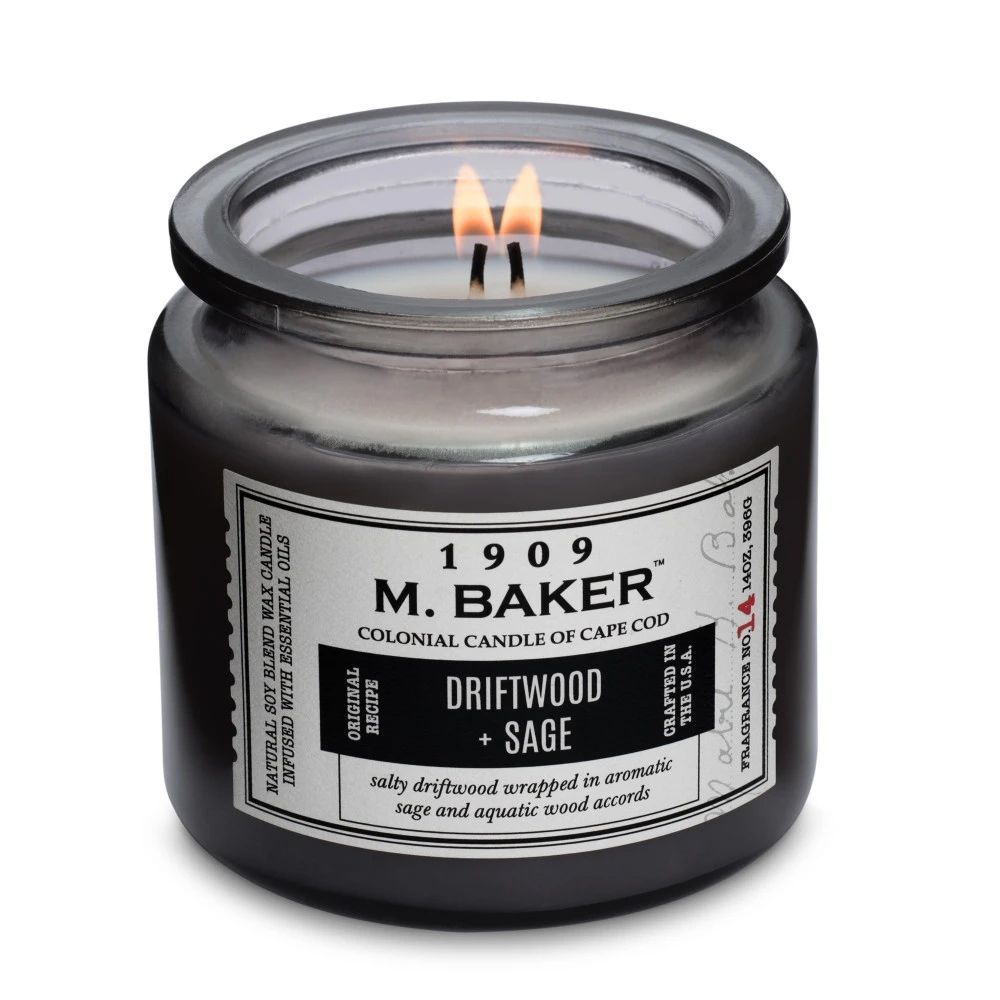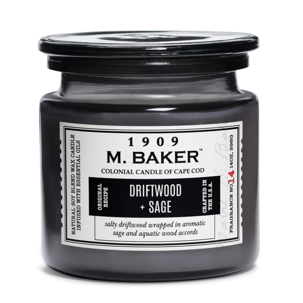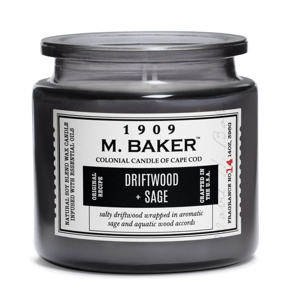 Description Driftwood & Sage 14 oz. M. Baker Large Jar Colonial CandleFeaturing two premium cotton wicks, Colonial's Driftwood and Sage soy wax blend has an approximate burn time of 60 hours.Weight: 14 oz.