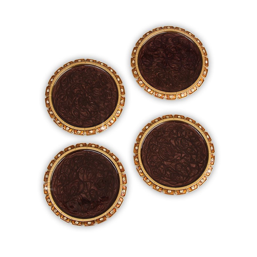 Jay Strongwater s first barware collection brings refined luxuries to cocktails. The Bentley Jeweled Edge Coasters are the ultimate in elegance, banded in cognac enamel adorned with faceted crystals.