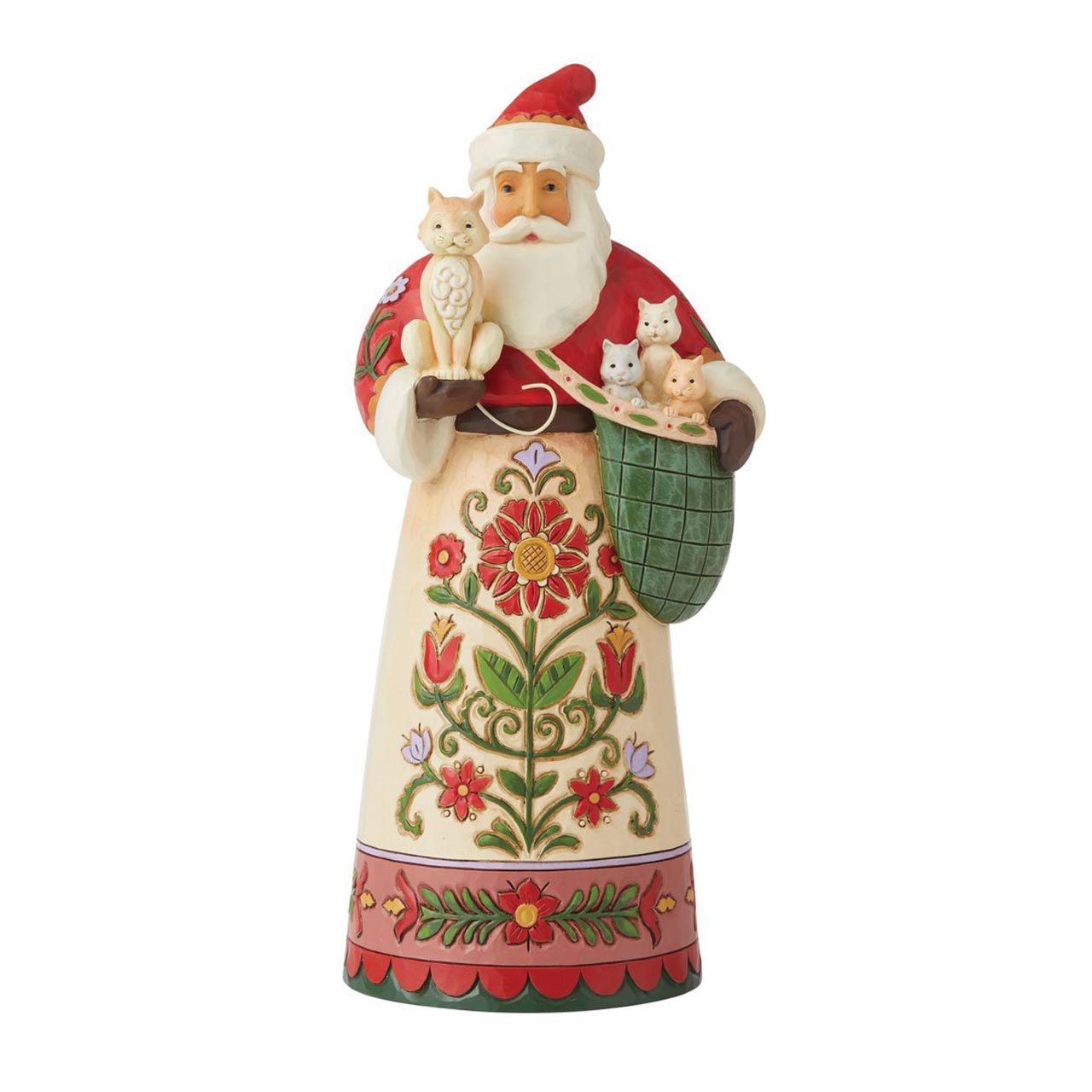 This spectacularly dressed Jim Shore Santa carries a cluster of Christmas cats in his bag. With a floral cloak and holly brimmed bag, Santa delivers gifts that keep on giving-and meowing! These festive feline surprises can't wait to join your family.