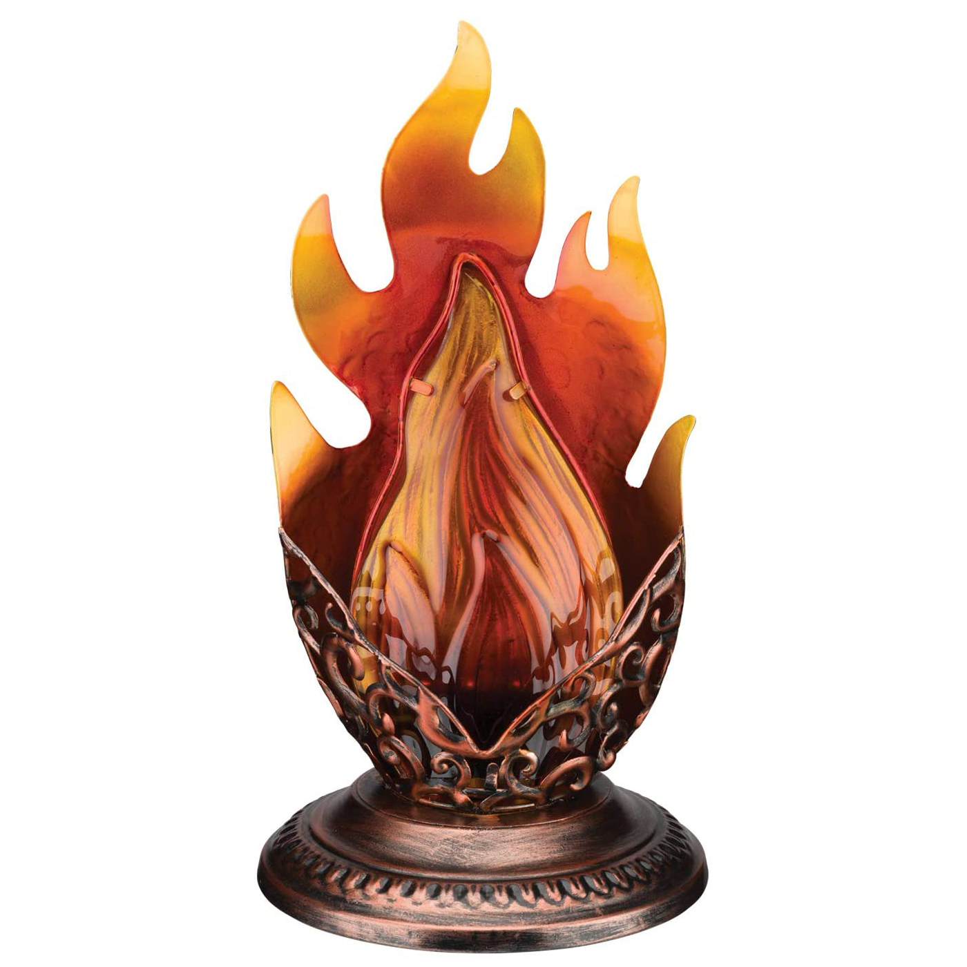 These lanterns are amazing to watch. The Red & orange glass & brightly colored metallic backing glisten in the sun & resemble a flame, but when activated the flame shaped glass comes alive with what looks like a flickering flame. Powered by 3 AA batteries (not included).