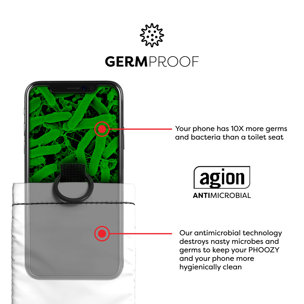 - GermProof. NEW! AGION¨ Antimicrobial lining reduces microbes by up to 99.99% to keep your PHOOZY and your devices hygienically clean.