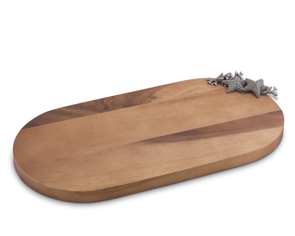 Present your beautifully prepared cocktail condiments on our lustrous acacia bar board finished with a detailed pewter marine life embellishment featuring starfish, coral and sea snail shells. This board is also the perfect size for serving seafood bites for two.