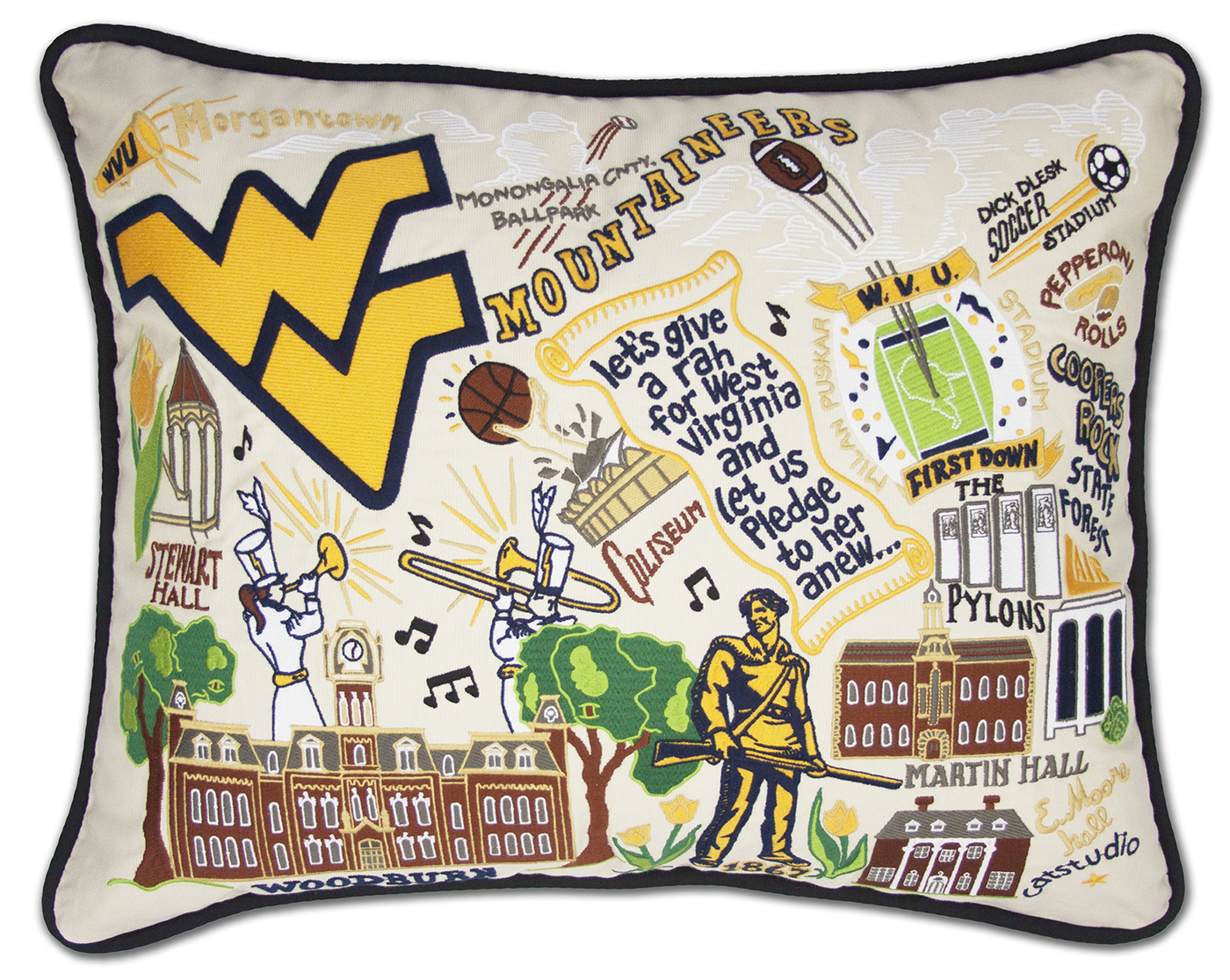 This pillow is embroidered on a light tea-color cotton cover that zips off for cleaning. Accented with black piping.